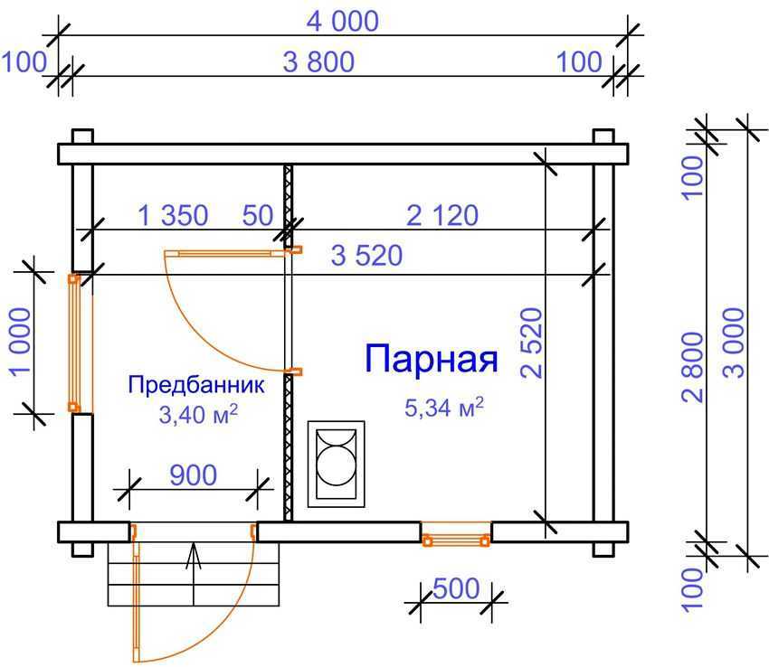 Рекомендуется заранее определиться с размерами каждого из помещений и обозначить их в чертеже. Стандартные размеры парилки — 200х240 см. Оптимальная высота потолка составляет 220 см. В такой конструкции одновременно смогут находиться 2–3 человека.