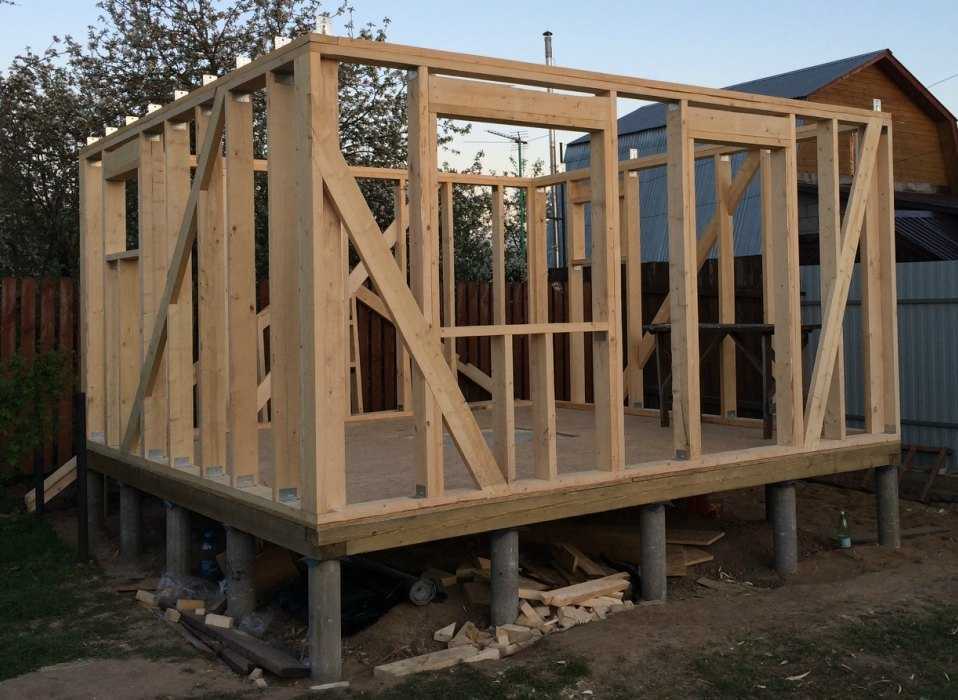 Строительство каркасной бани своими руками на видео демонстрирует процесс сборки от фундамента на сваях до крыши.