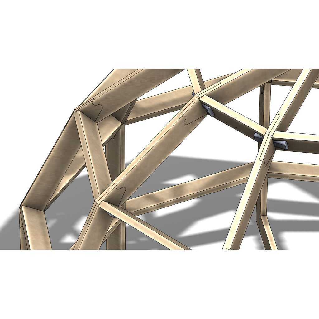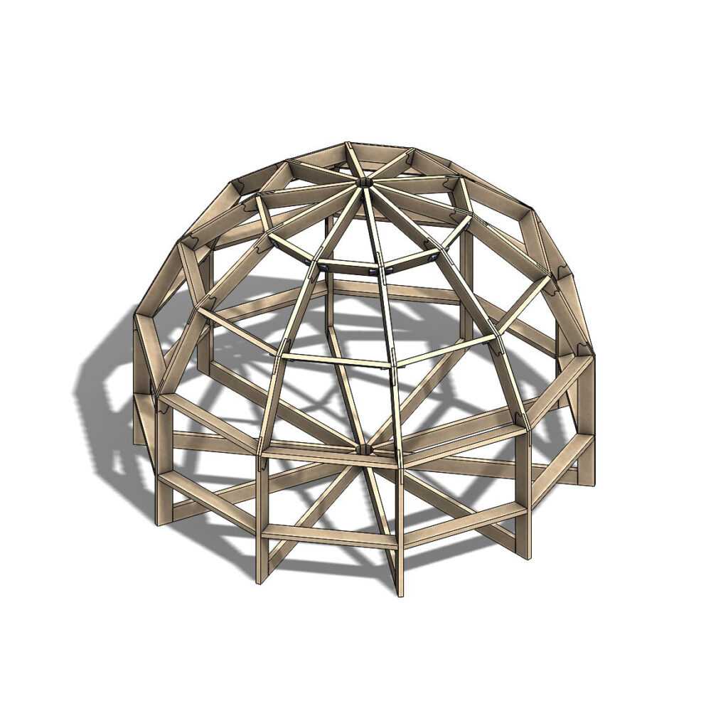 | Каркас с металлическими нержавеющими коннекторами в узлах соединения, включает лаги пола, балки купола и другие элементы из массива сосны 150х50 мм. Рекомендуем произвести обработку всех деревянных элементов конструктора купольного дома огнебиозащитой или антисептиком. |