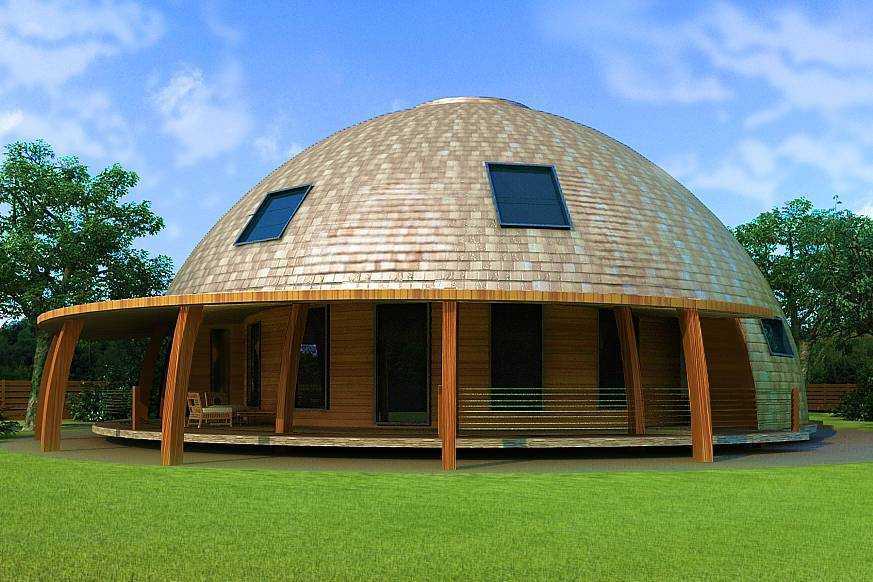 Стратодезические купола имеют наиболее изящные формы. Они собираются на основе гнутых ребер, идущих меридиональном направлении. В стратодезический купол легче всего вмонтировать привычные для нас двери и окна, пристроить к бане по стандартной технологии веранду или террасу. Для бани гнуто-клееный брус обойдется дорого, и это, пожалуй, единственное препятствие.
