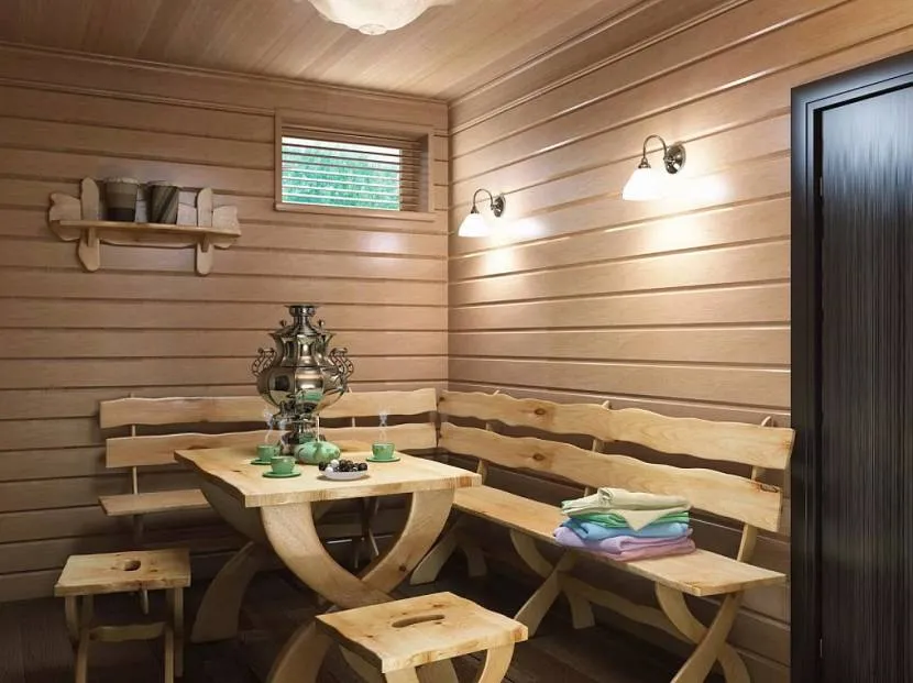 Баня – место, прежде всего, отдыха, поэтому динамичные формы и яркие цвета из интерьера лучше исключить. Обще правило – уютно, спокойно, без ненужных аксессуаров.