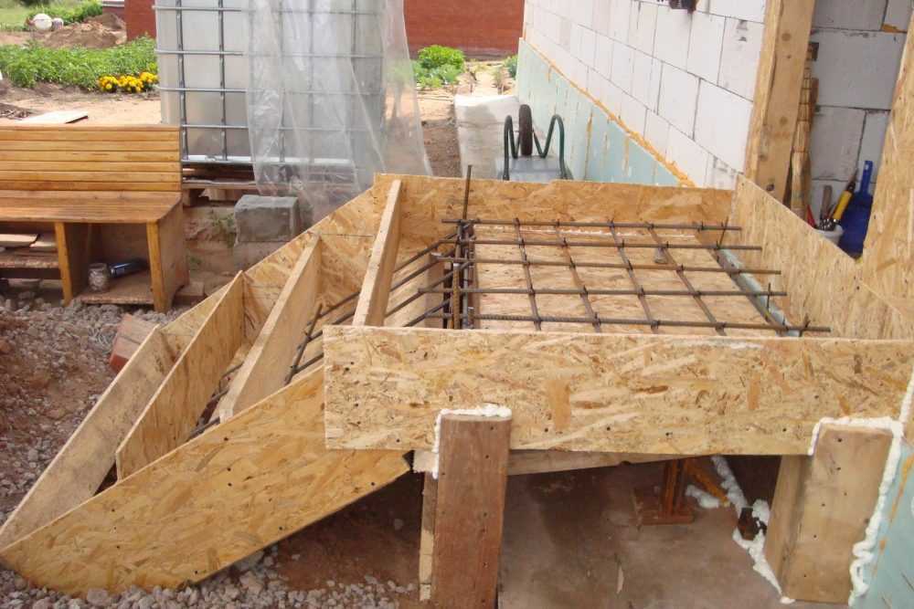 Опалубка под крыльцо может быть собрана и установлена и сразу, как показано на следующем фото, чтобы произвести заливку за один прием. В любом случае ярусы скрепляются между собой, а монолитной конструкцию делает арматура, которая должна выходить из одного ряда в другой.