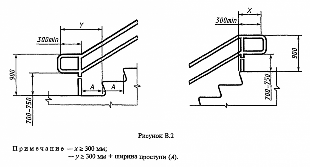 - на окончании нижнего марша перила и поручни должны выступать на 300 мм;