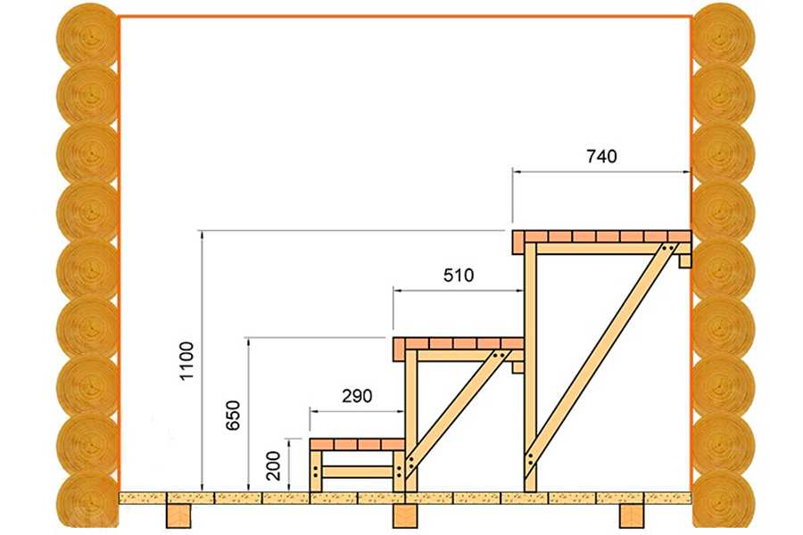 Стандартной считается установка в бане трехъярусных полок. На нижней будет прохладней, на верхней ‒ жарче всего.