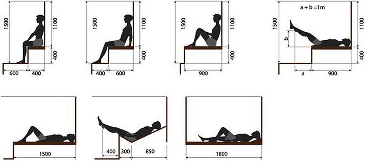 Рекомендуемый минимальный диапазон составляет от 1,5 до 1,8 м. При длине 1,5 м человек сможет расположиться на лавке с ногами, согнутыми в коленях. На полке 1,8 м большинство отдыхающих сможет лечь в полный рост.