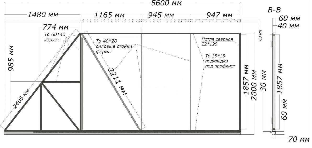 На них указываются ширина, высота конструкции, выполняется чертеж роликовой опоры, обозначаются размеры направляющей и откосов, которые выполняют функцию противовеса во время открывания ворот.