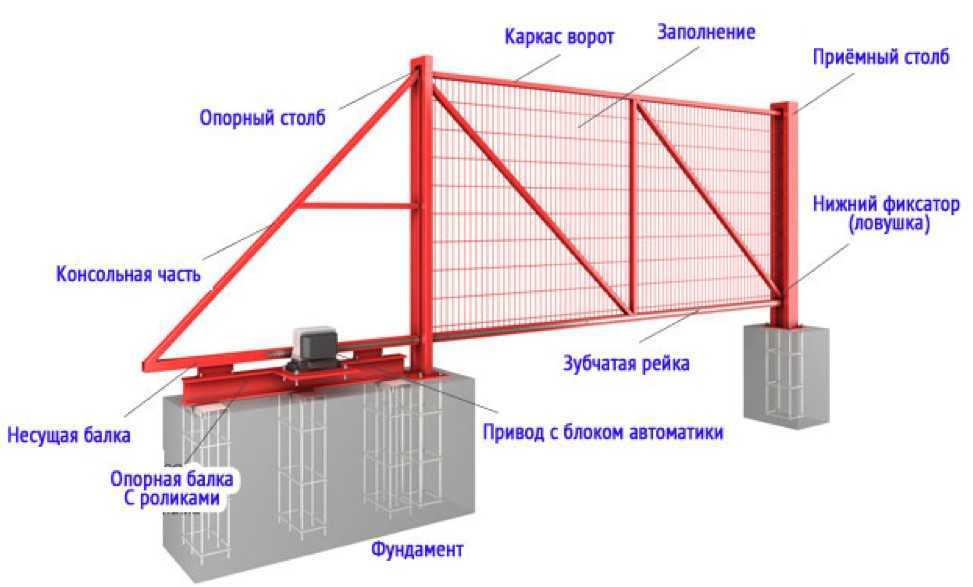 Данные элементы — основная составляющая всего механизма откатных ворот. Состоит вся конструкция из: