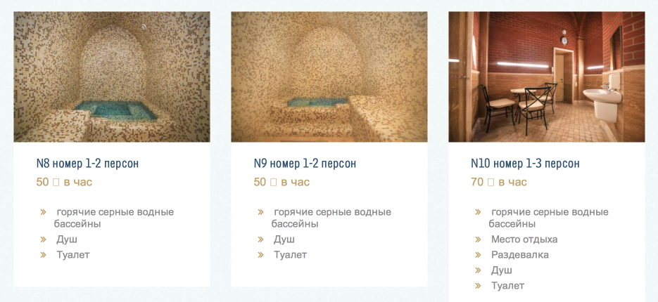 Цены на индивидуальные кабинки стартуют от 50 лари. Проблема в том, что раньше за эти деньги получить хоть какое-то бы ни было удовольствие можно было разве что сильно зажмурившись. Помню свой печальный опыт посещения одной из считавшихся тогда «нормальной» серной бани: ремонт, судя по тому, что я увидел, застал времена ещё самого Горгасали, душ не работал (на мой вопрос «почему не работает?» получил шикарный ответ — «не знаю»). Фена не было, розетка была сломана, карты принимали лишь номинально — по факту оплата не проходила.