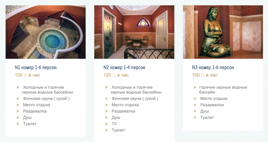 Сегодня бани разделены на женские и мужские залы, есть отдельные номера.