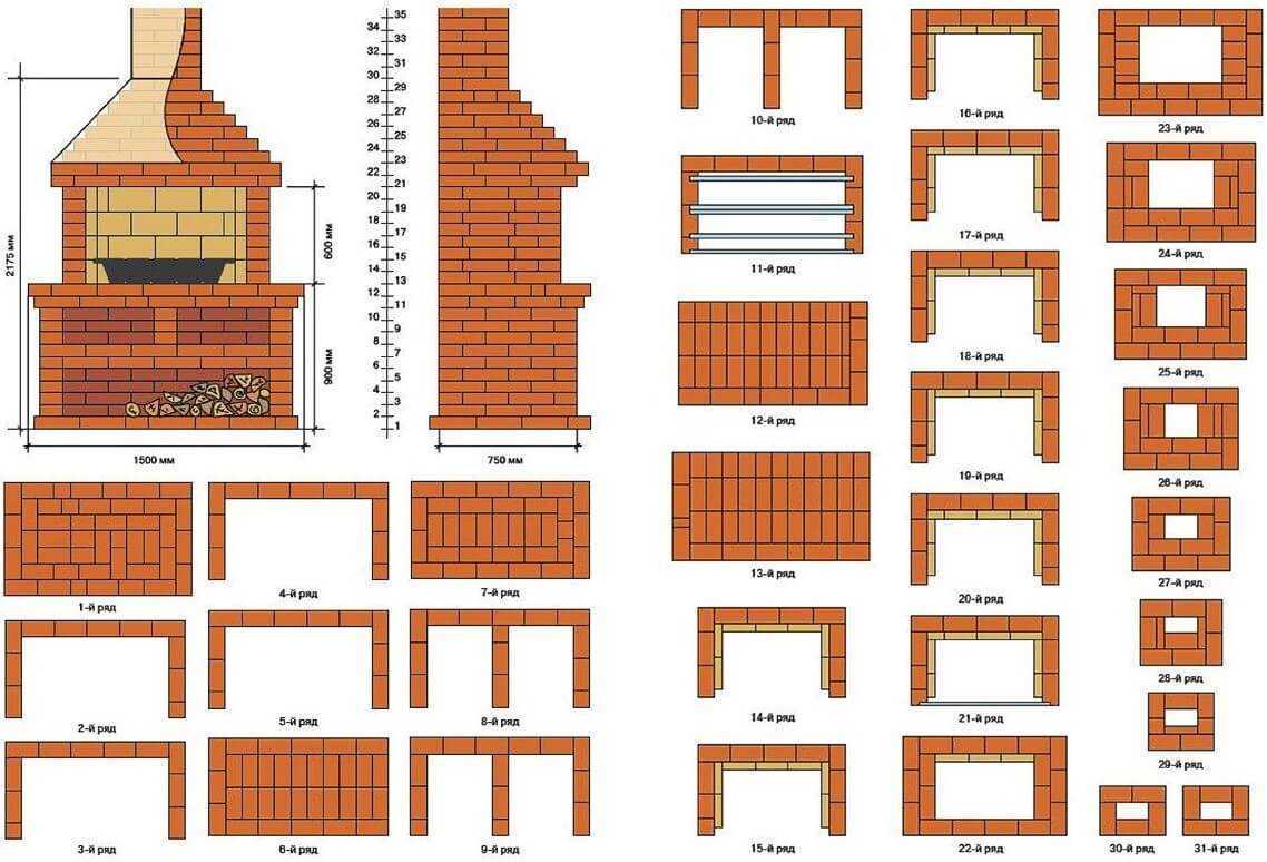 - Готовый каркас обкладывается кирпичом. Первый ряд выставляется кирпичом перпендикулярно задней опорной стенке, второй и последующие – параллельно, со смещением 17 мм, создавая необходимую пирамидальность;