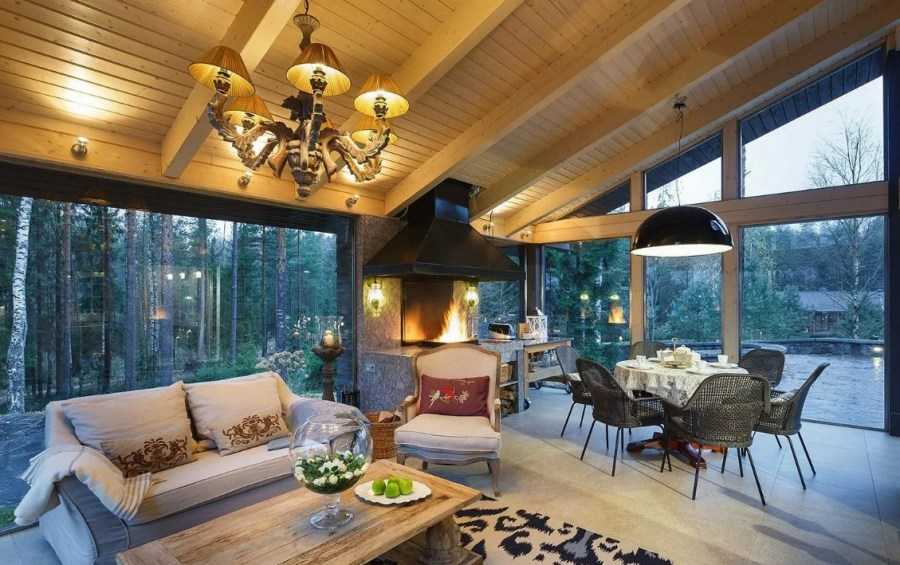 Некоторые веранды пристраивают к деревянному частному дому с выходом в столовую или гостиную, пространство зонируют и получают кухню и зону отдыха. Альпийский стиль оставляет место для оформления дизайна декором в виде шкур.
