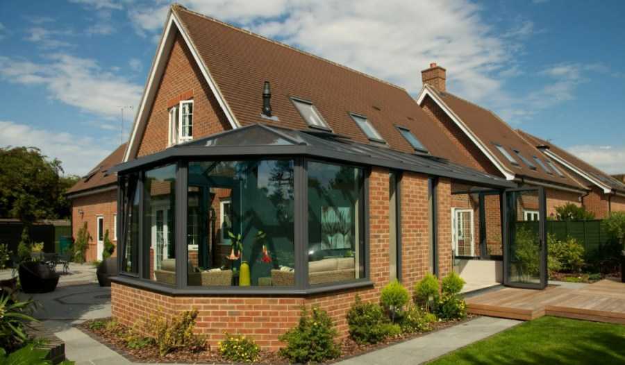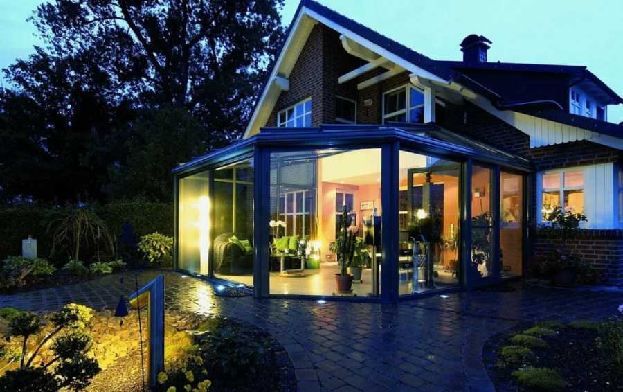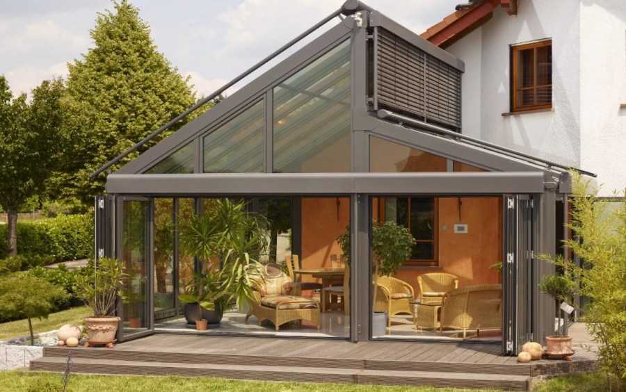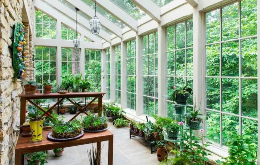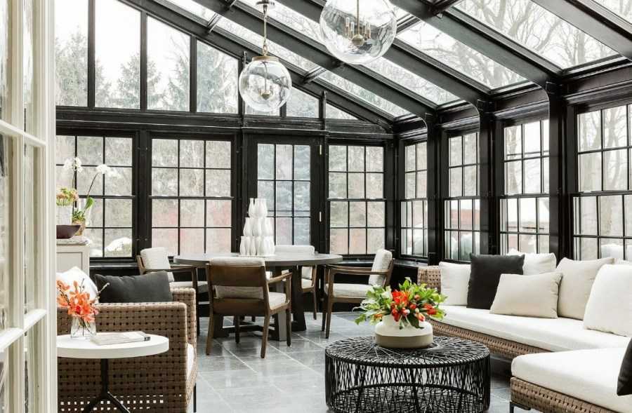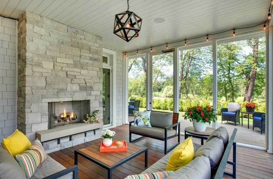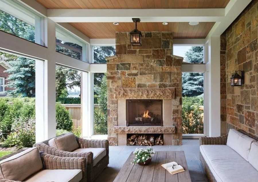 Застекленные или поликарбонатные веранды могут использоваться всесезонно. Здесь можно хранить мебель, сделать зимний сад или даже установить камин с двухсторонней топкой.