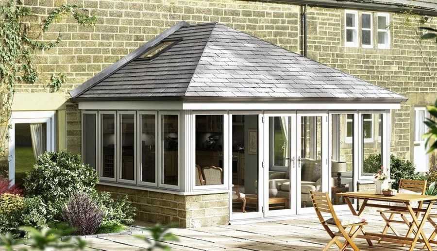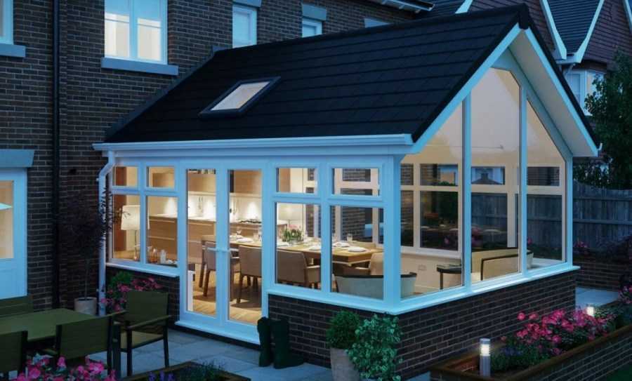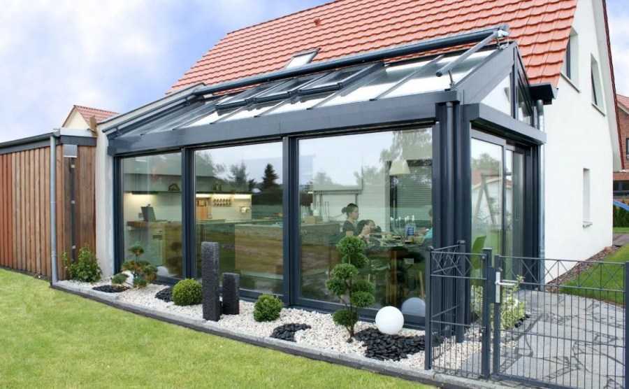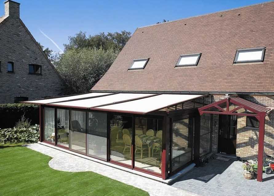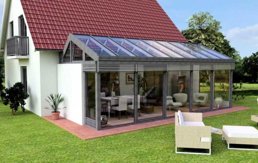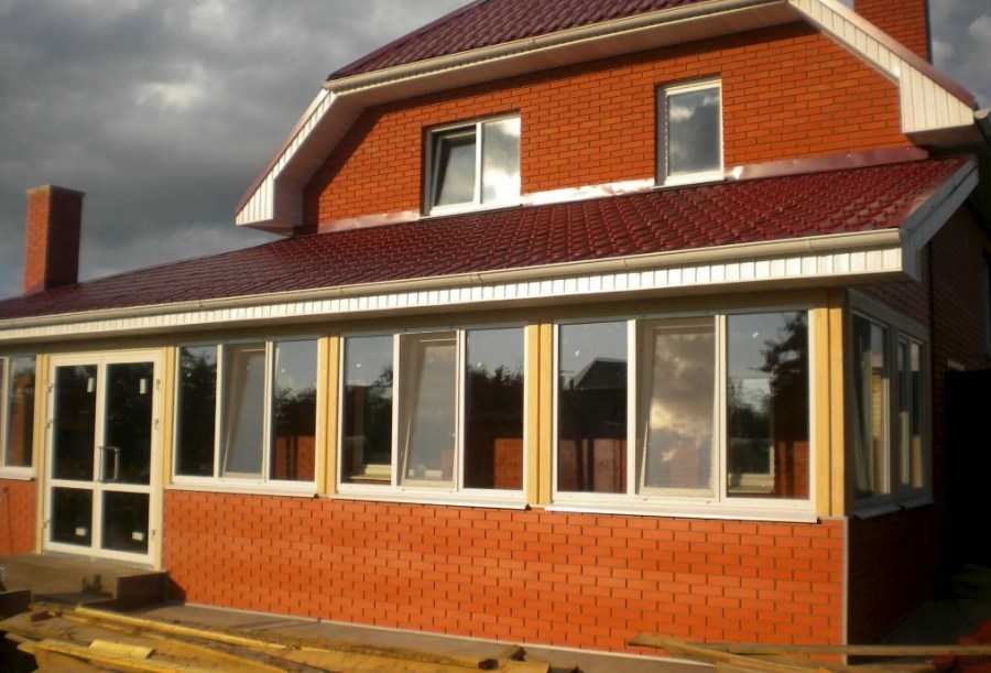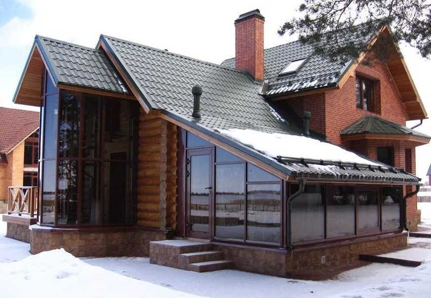 Обязательно условие — она должна быть в усеченной формы. Зимняя веранда к дому делается с крышей из керамической или металлической черепицы, ондулина, шифера, профнастила, поликарбоната.