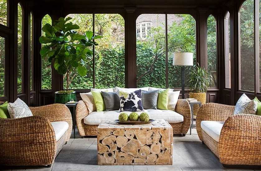 Существует несколько способов оформления веранды. Главным критерием в таком помещении загородного дома является наличие большого количества света. Но бывают моменты, когда избыток солнечных лучей не уместен. Для этого используют элементы способные уменьшить освещённость данного помещения: