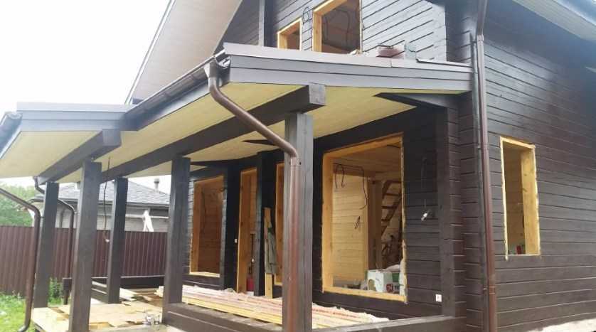 Навес, имеющий опору на фасад, недопустим — так стропильная система окажется жестко прикрепленной к стенам веранды, а они станут со временем оседать.