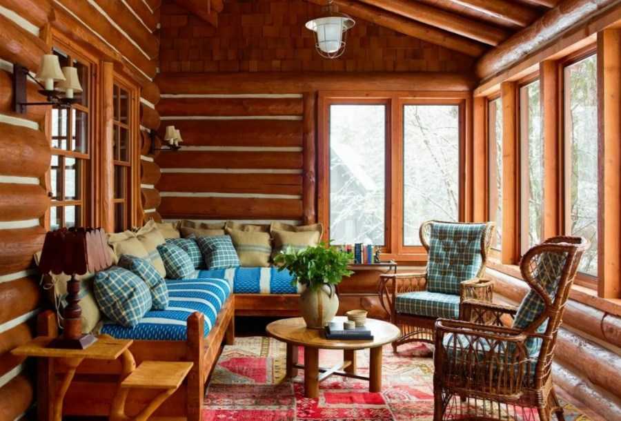 Домик в деревне предполагает строительство веранды из дерева и ее оформление в соответствующем стиле — с ткаными дорожками, занавесками с вышивкой, самоваром и глиняными горшками, простой и удобной мебелью.