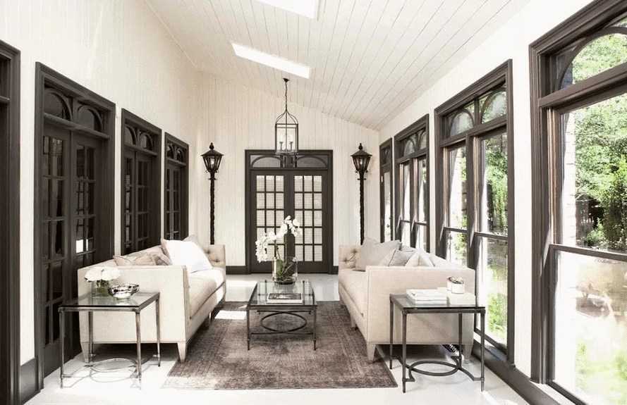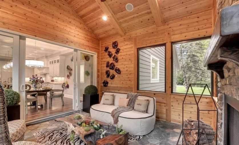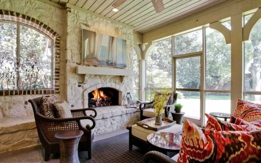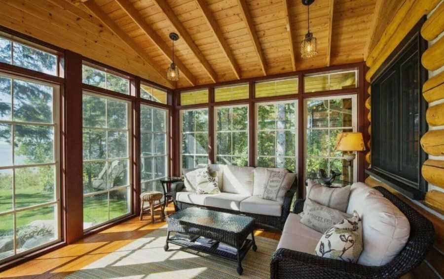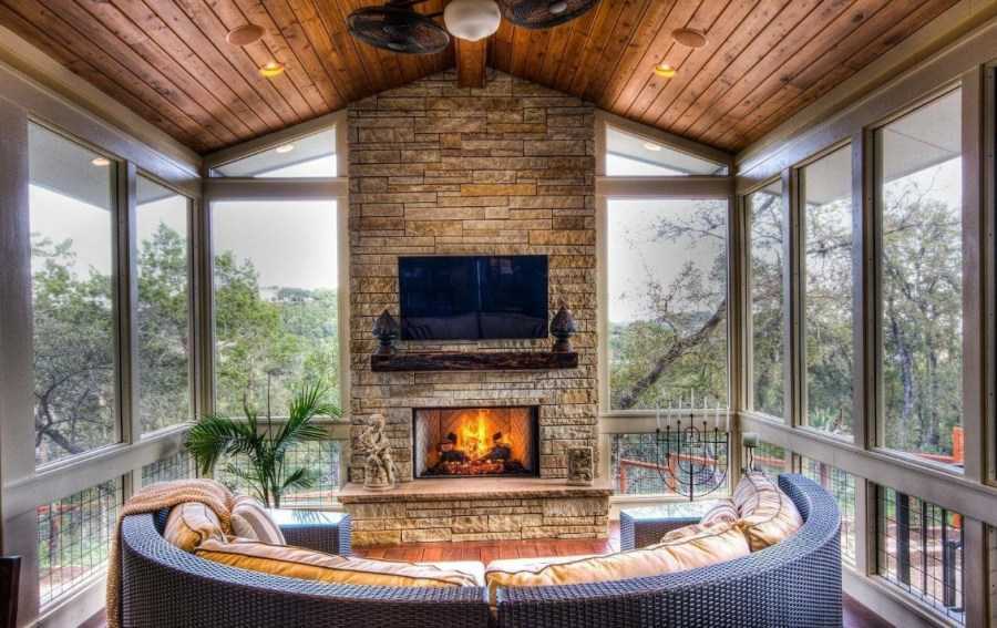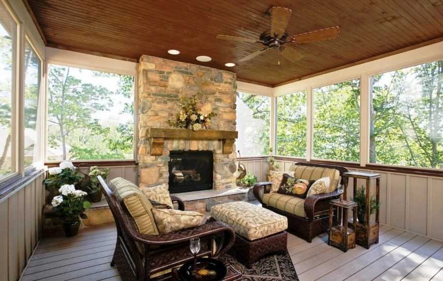 Если дизайн веранды продуман грамотно, то она сможет превратиться в практичную комнату для проживания, а самое главное – для отдыха. Большие окна и раздвижные двери смогут максимально приблизить людей к природе, которые находятся в этом помещении. Можно соорудить камин, поставить удобную мебель.