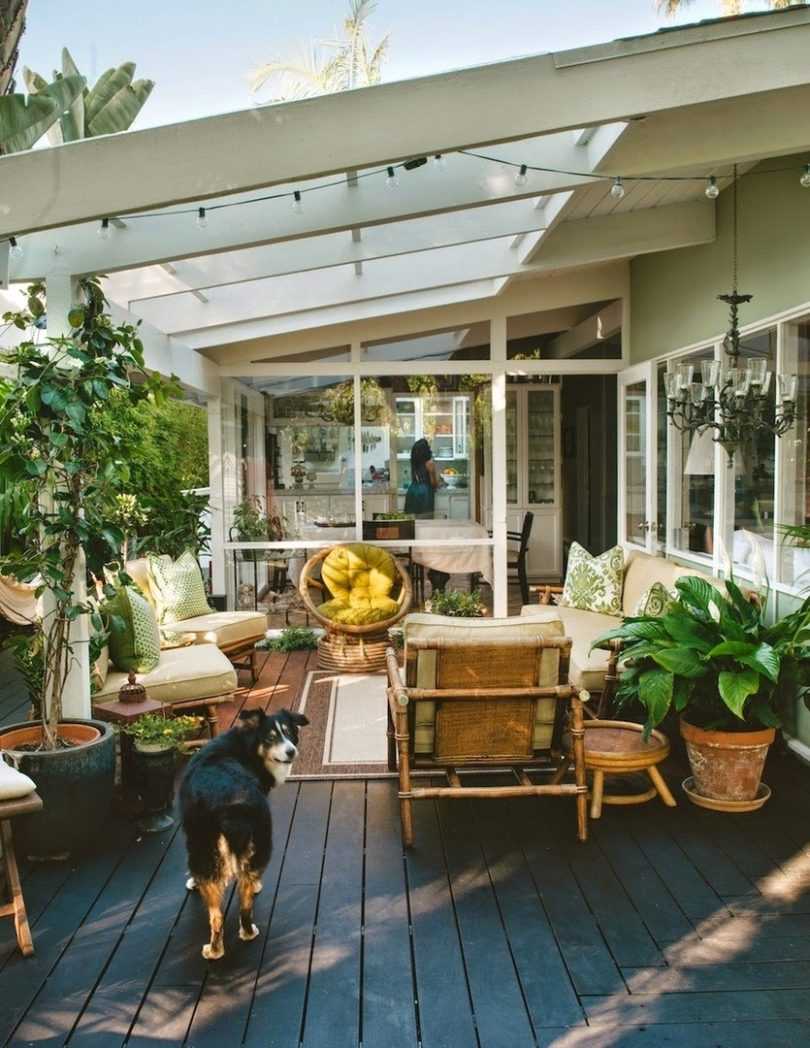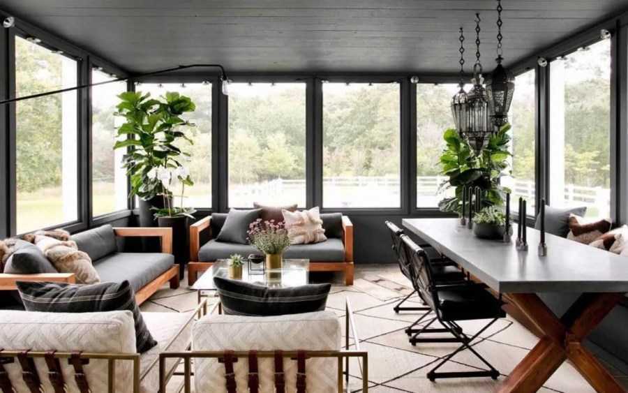 Теплый скандинавский стиль на веранде будет смотреться довольно органично и придаст помещению уюта. Он подойдет как для открытой, так и для закрытой планировки.