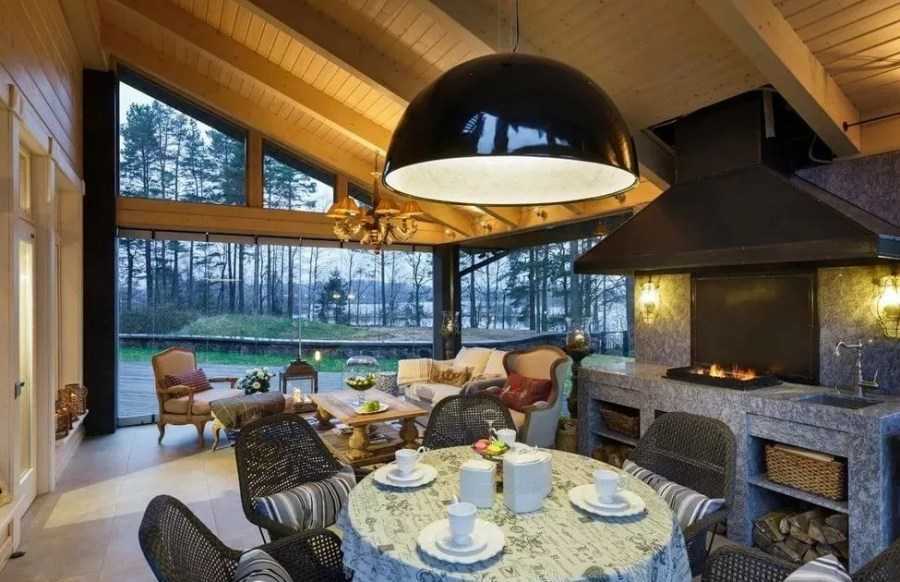 При желании внутри веранды можно установить большой стол, угловую витрину и даже дровяной камин. Но соответствующие эксперименты больше годятся для сложных оригинальных проектов. Сама веранда преимущественно призвана служить пристанищем для комфортного отдыха напротив живописной природы.