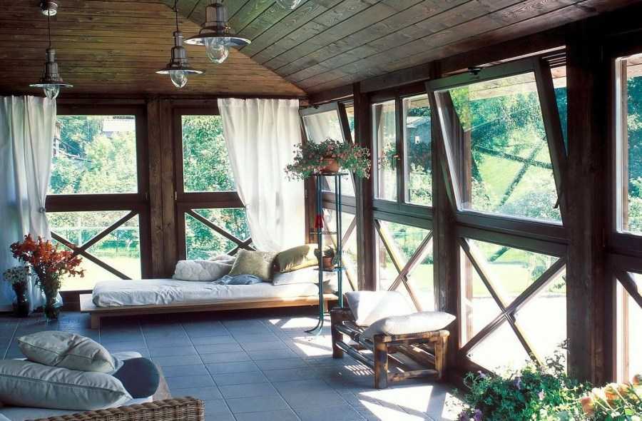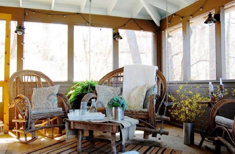 Внутри закрытых веранд можно запросто устраивать мягкие кресла, диван и ковер. Окна идут вместе с короткими занавесами. Если конструкция открытая, то она приветствует кресло-качалку, гамак и подвесные кашпо. Последние прекрасно смотрятся в зимнем саду.