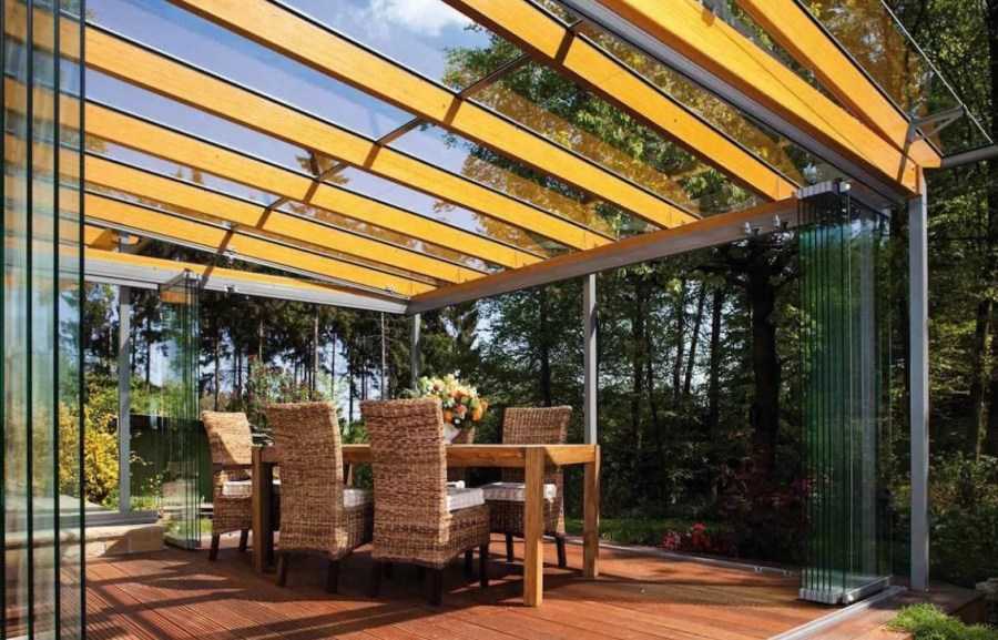 Интересная идея дизайна для веранды – сплошь застекленное помещение с раздвижными стеклами без рам. Такой вариант, хоть и будет довольно холодным, но защитит от атмосферных осадков.
