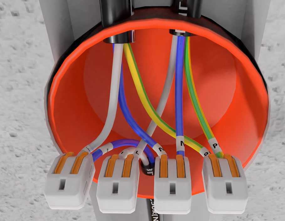 Далее, кабель идущий на светильник, также заводим в распредкоробку. Внутри нее соединяем все жилы в следующей последовательности.