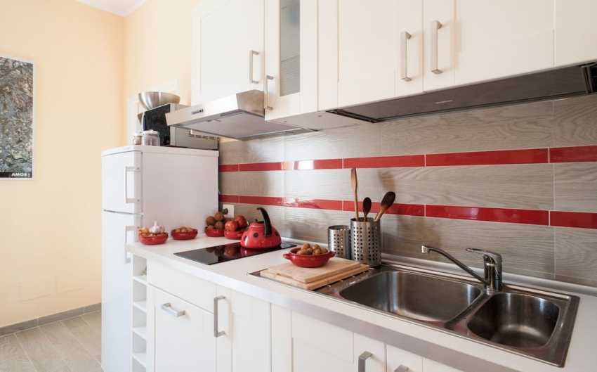 Высота столешницы варьируется в диапазоне от 80 до 90см. Далее идет пространство с фартуком примерно 55-60см, а над ним навесные шкафчики.
