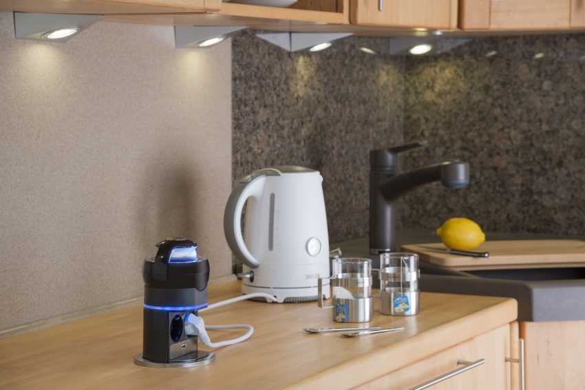 То есть, всего над столешницей желательно установить 2 розеточных комплекта. Если внешний вид их вас не устраивает, обдумайте варианты при которых их придется встраивать в столешницу. Выдвинутый блок наружу выглядит как небольшая коробочка. Под него тоже нужна розетка, ведь протягивать сверху шнур не эстетично.