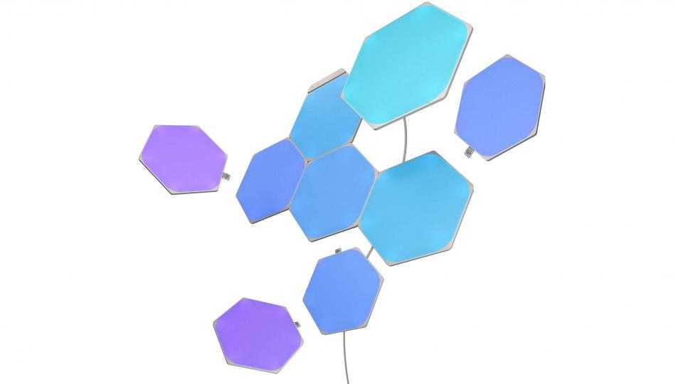 Базовый набор Nanoleaf Shapes состоит из девяти шестиугольных панелей, которые можно расширять при помощи пакетов Shapes Expansion. Есть большие и маленькие треугольные панели, которые можно соединять друг с другом.