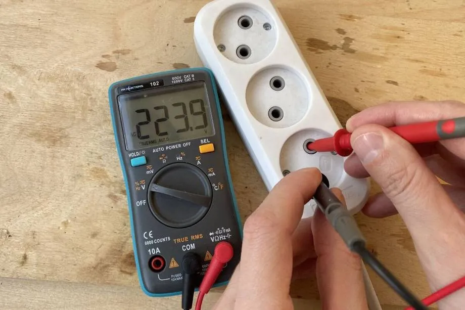 Мультиметр подготавливается, производится контрольное измерение напряжения в розетке. Это позволяет убедиться в отсутствии обрывов на линии и работоспособности самого устройства. Если полученные на дисплее цифры корректны, подсоединение выполнено верно.