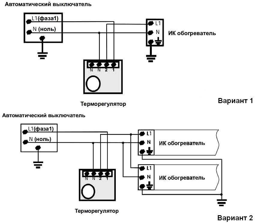 Есть несколько схем, позволяющих осуществить подключение терморегулятора к инфракрасному обогревателю.