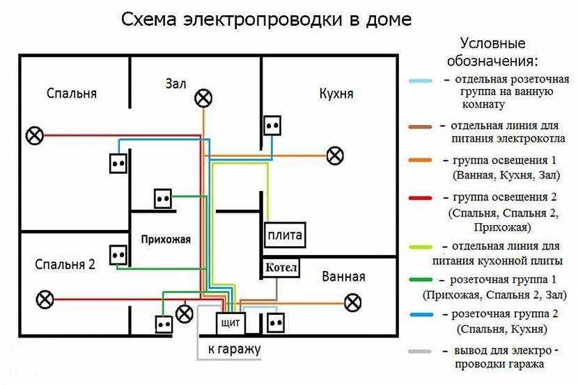 Дополнительная сложность составления схемы электропроводки заключается в сопоставлении ее рабочих параметров с мощностью приборов. Поэтому заранее нужно знать, что и где будет стоять, и какие нагрузки на сеть будет оказывать.