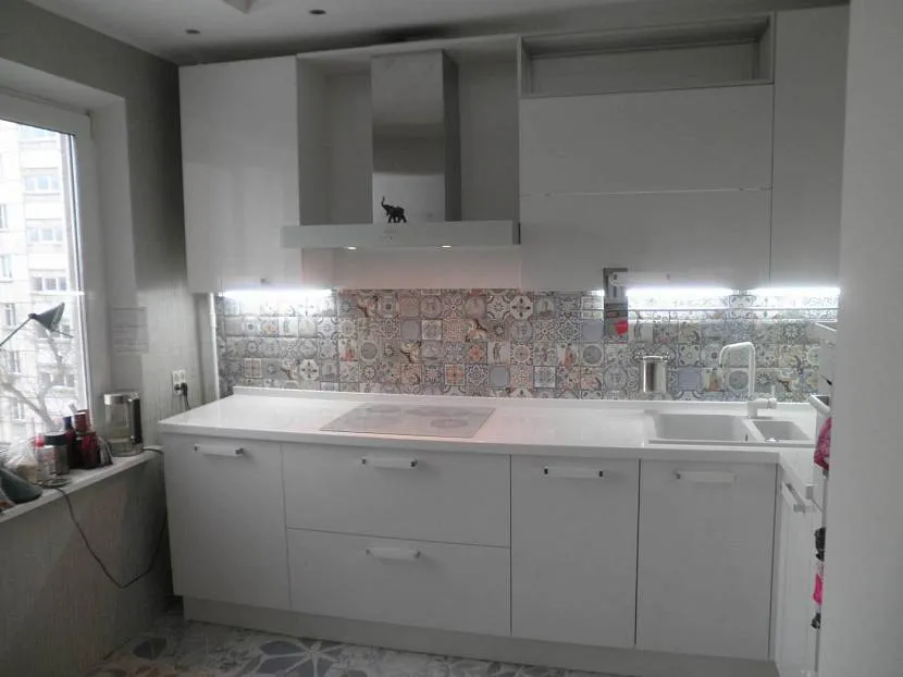 белые глянцевые фасады делают пространство кухни светлее и воздушнее