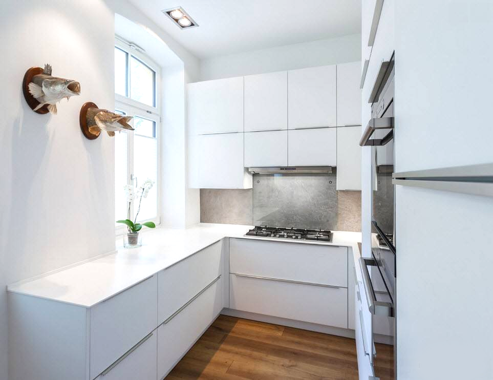 А теперь поговорим об отделке. Когда кухня экстремально мала, значение имеет даже то, как уложен пол и оформлены стены. Так, отделка пола широкими и длинными досками, а также облицовка стен обоями с большим и ярким принтом, «съест» и без того крохотное пространство. Зато правильная отделка поможет здорово его расширить.