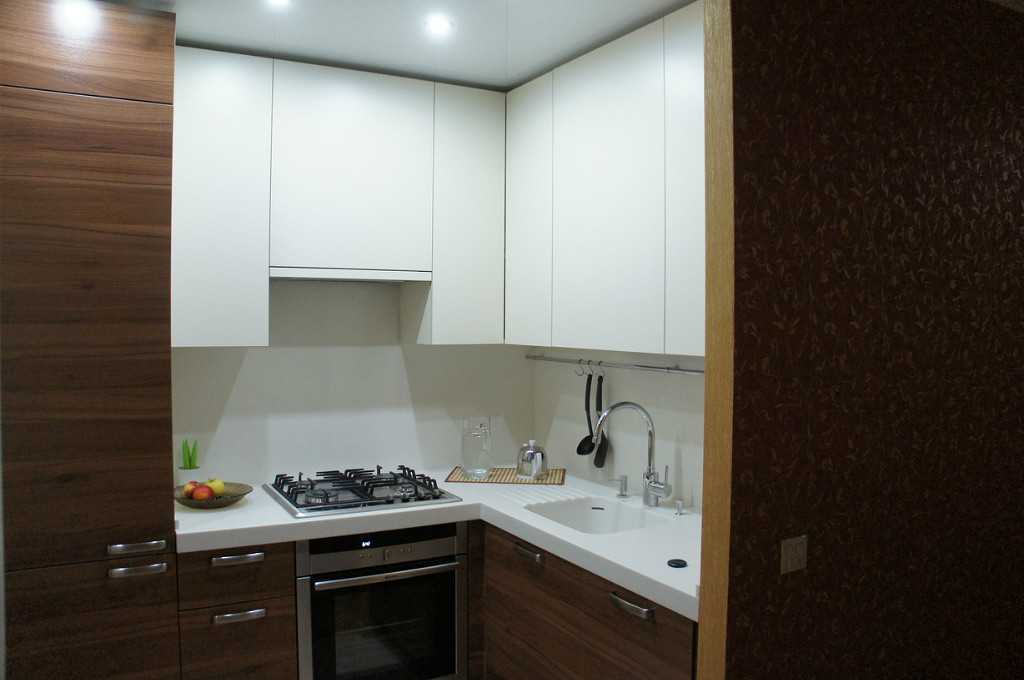 В небольшой комнате будет уместна расстановка мебели в форме буквы Г. Это позволяет сохранить удобный рабочий треугольник между холодильником, варочной поверхностью и мойкой. Таким образом будет затрачиваться намного меньше времени на приготовление пищи, ведь не придется делать никаких лишних движений. Такое решение поможет рационально использовать пространство и задействовать все зоны максимально эффективно. Интерьер кухни оказывается разделен на две части – рабочую и обеденную. Даже столь маленький размер комнаты не помешает организовать правильное зонирование и использование территории. Также угловые модули предоставляют дополнительное пространство для посуды и продуктов питания.