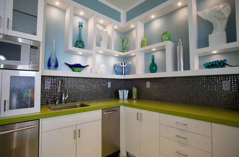 Открытые полки хороши в тех домах, где мало пыли летит из окон, и хозяйка имеет достаточно времени на поддержание идеального порядка над столешницей. Как правило, подобный вариант хорош, когда посуды мало, и она не собирается в пестрые стопки внутри шкафов.