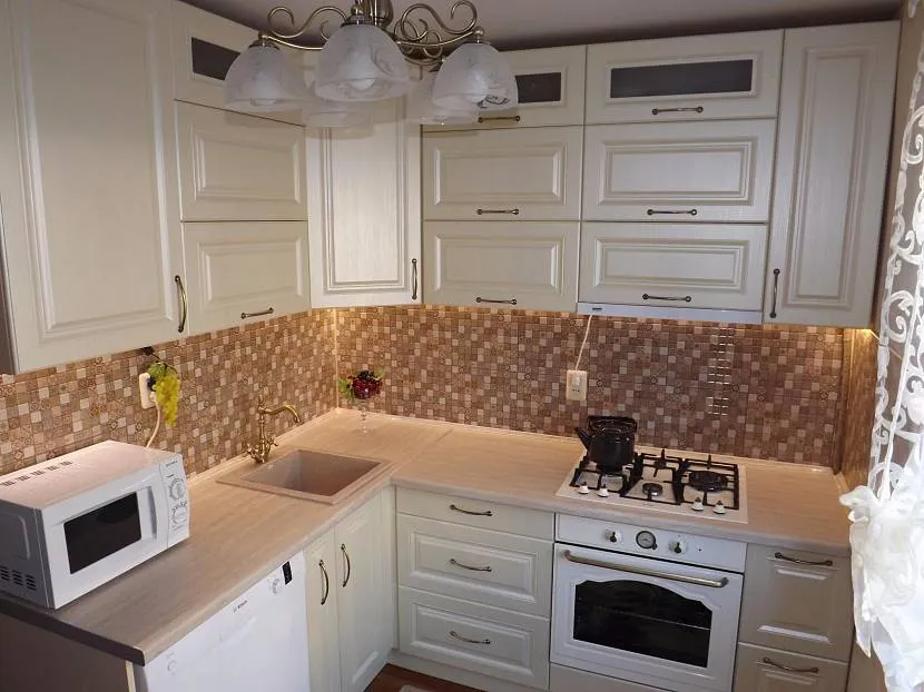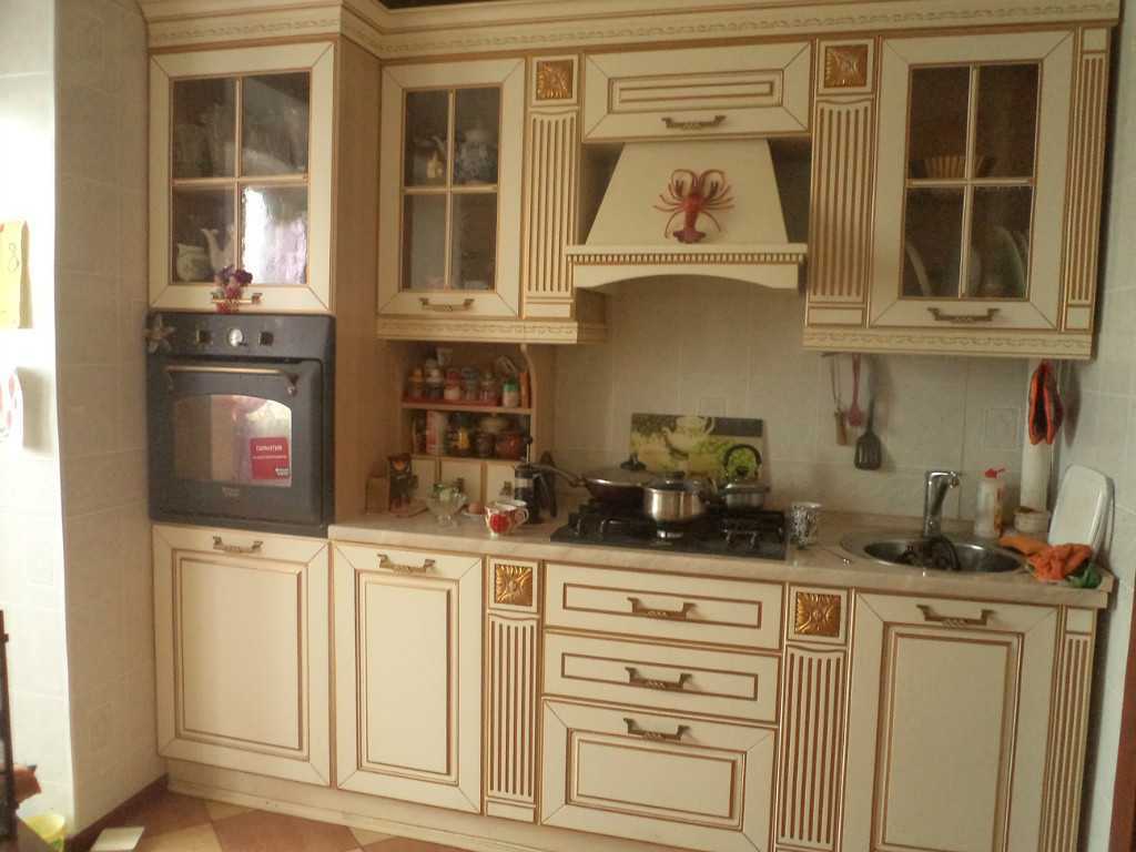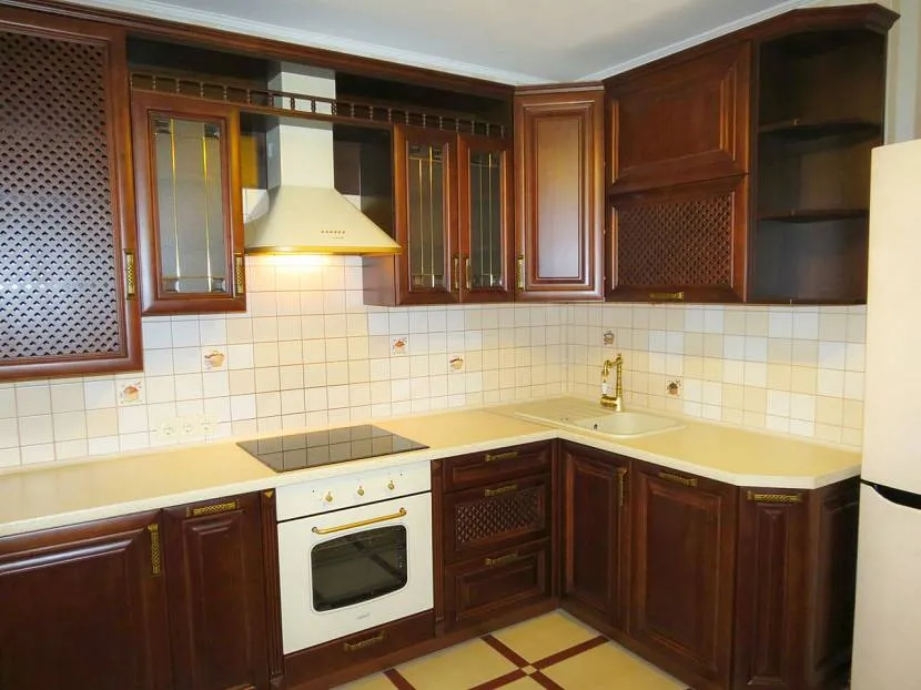 Классическая мебель делается из дерева, дверцы шкафов, фасады могут быть оформлены стеклянными вставками, резьбой. Интересный дизайн небольшой – всего 3 метра – классической кухни представлен на нижнем фото.