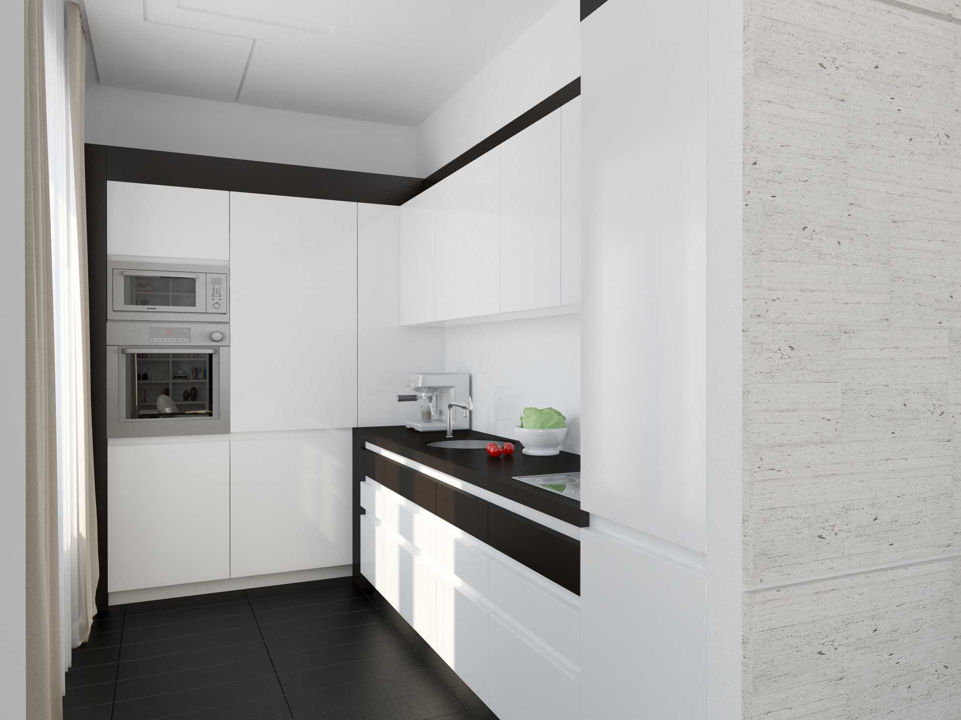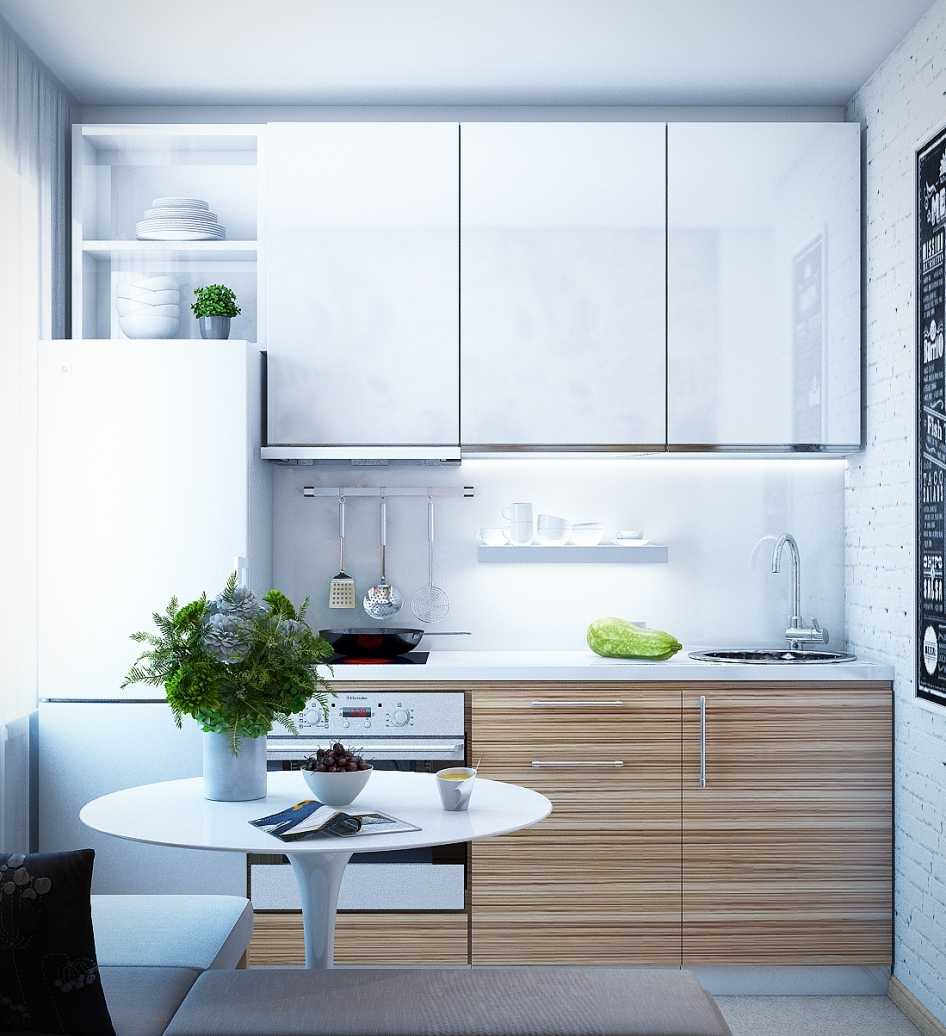 На небольшой кухоньке вдоль одной стенки можно установить прямую кухню без холодильника, вынеся его в прихожую. Строгость минималистического стиля подчеркнут прямые линии мебельных шкафов и пеналов.
