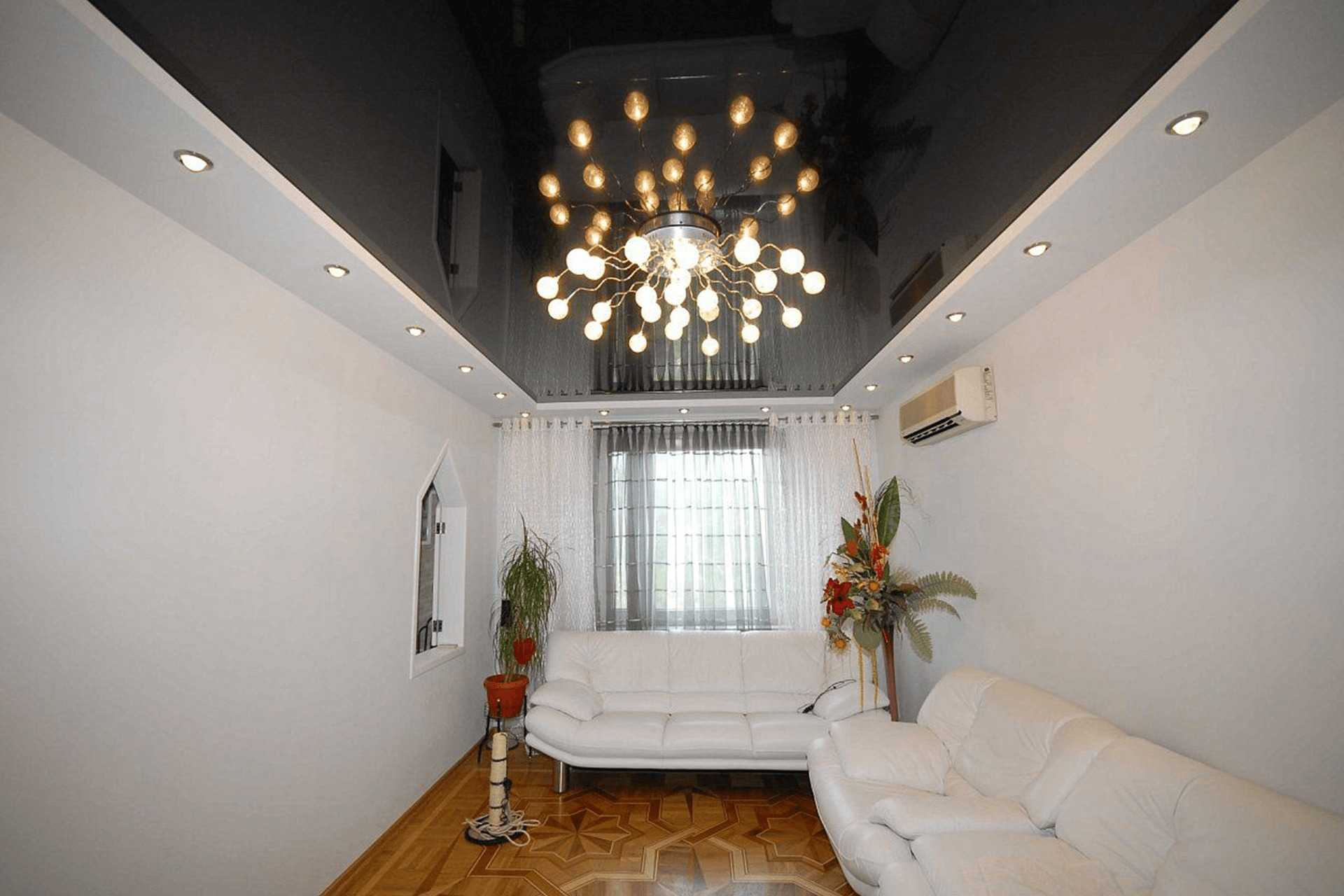 На фото глянцевое натяжное полотно черного цвета в просторной гостиной.