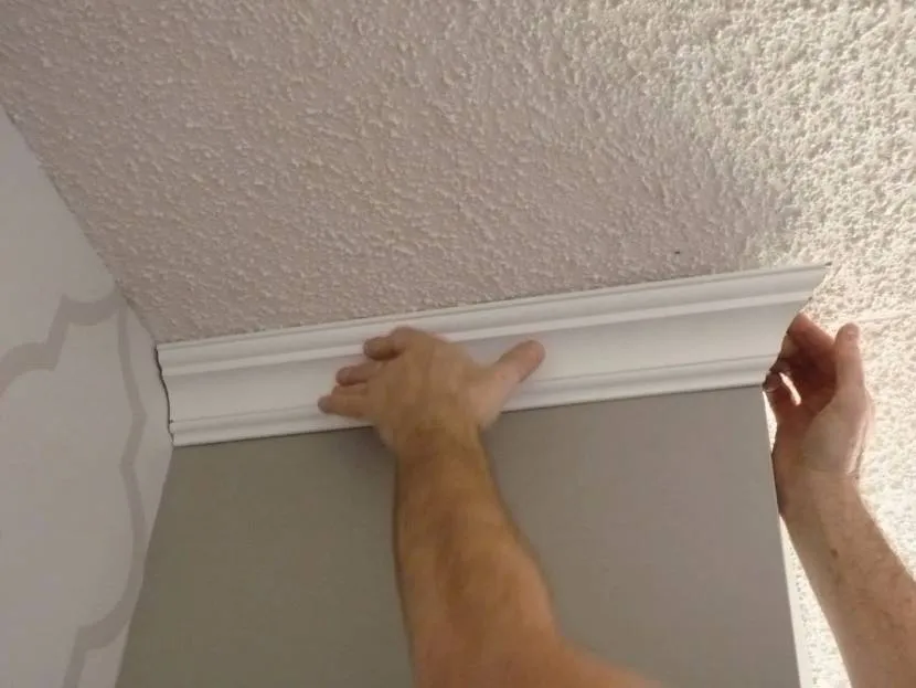 - Молдинг прижимают и держат 1-2 минуты, излишки шпаклевки убирают (можно распределить их по стене).
