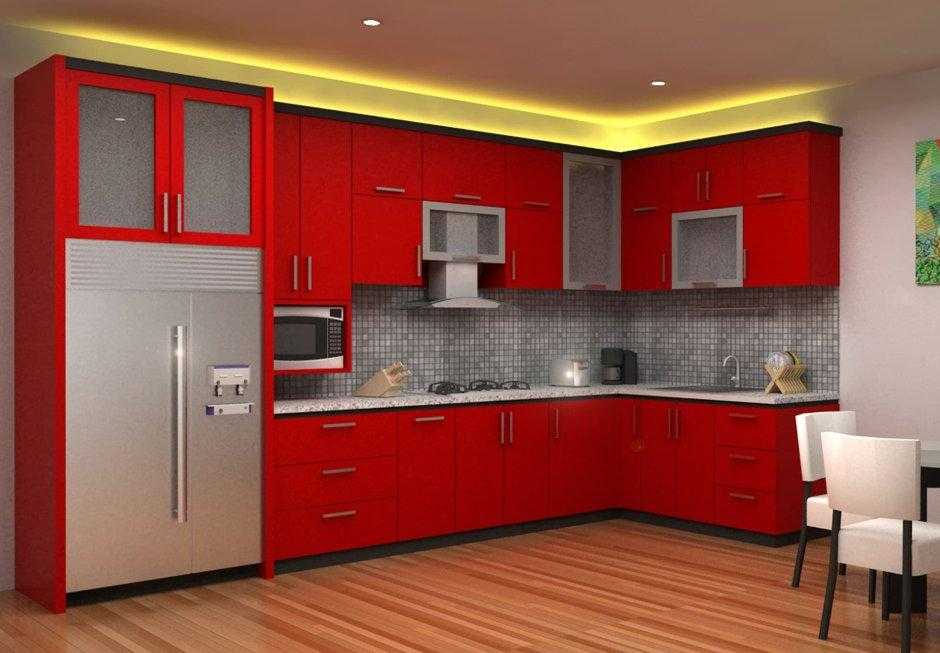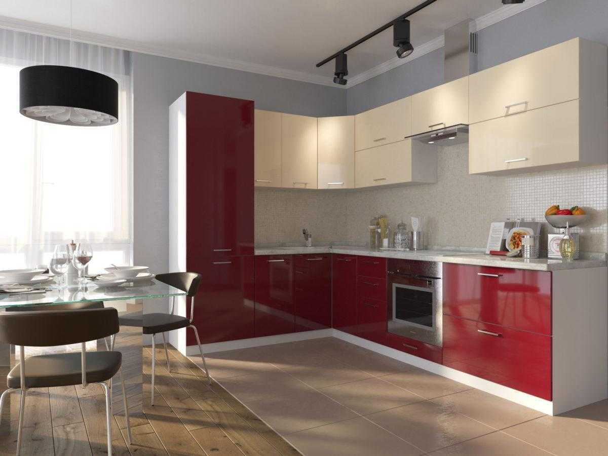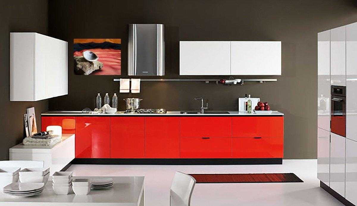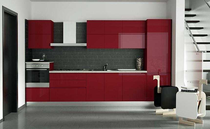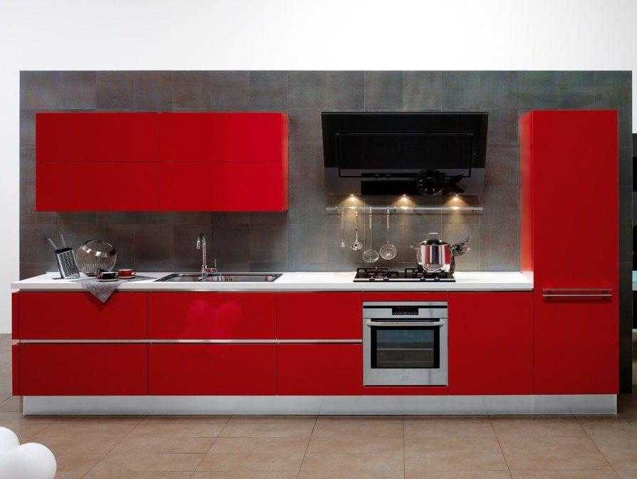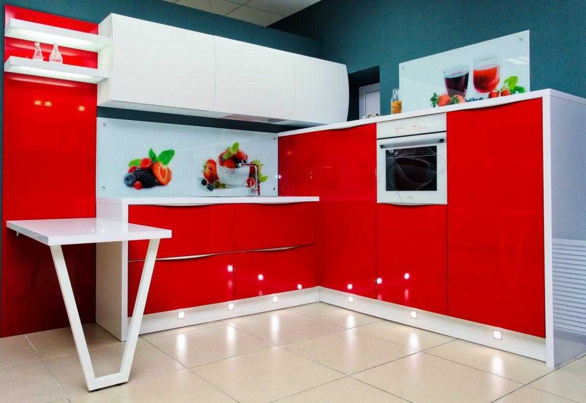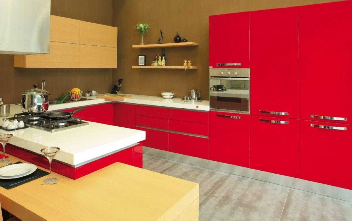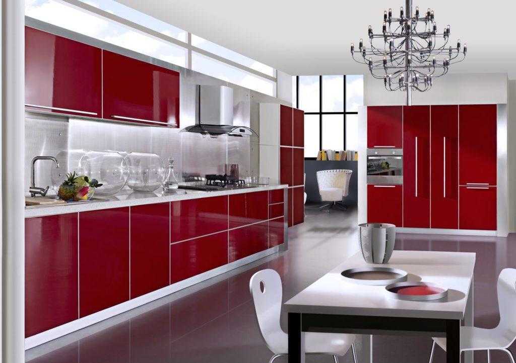 Наносится на МДФ или ДСП панель. Это долговечный гарнитур, который не потеряет форму и алый цвет. Красный фасад с алюминиевыми вставками и стеклом увеличивают срок эксплуатации гарнитура.