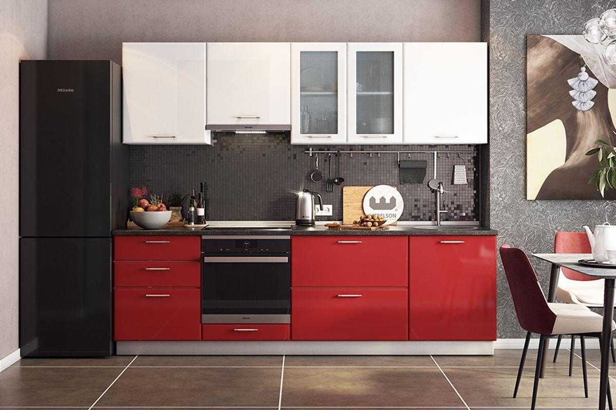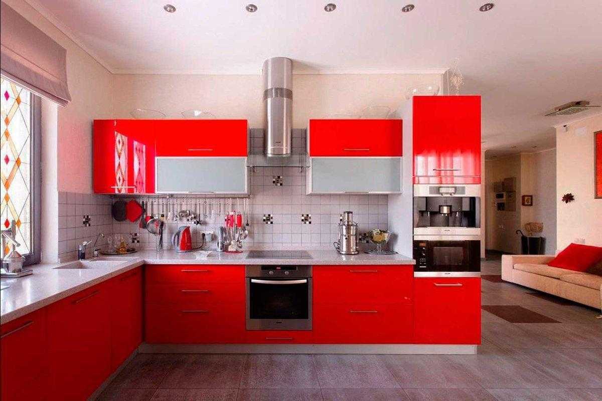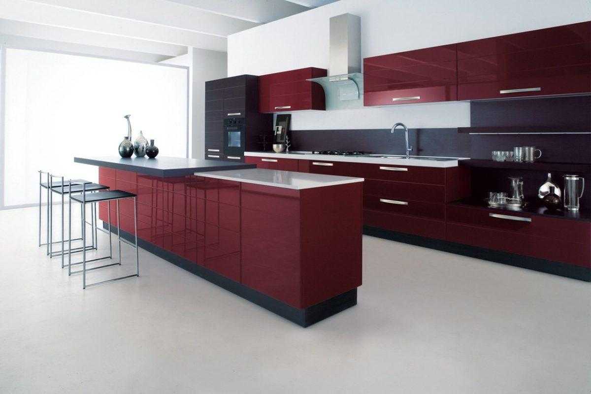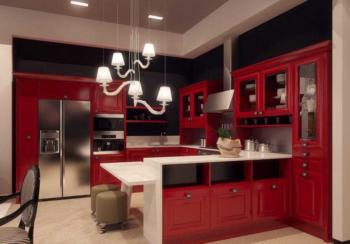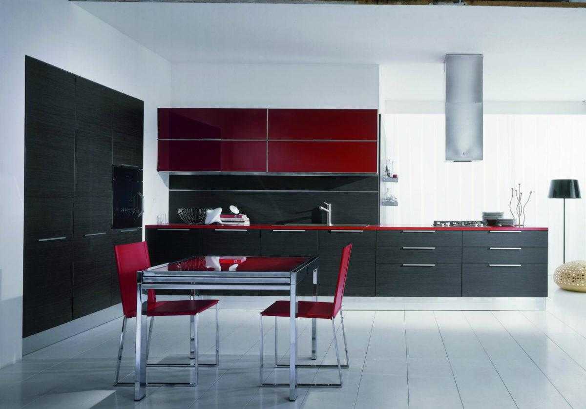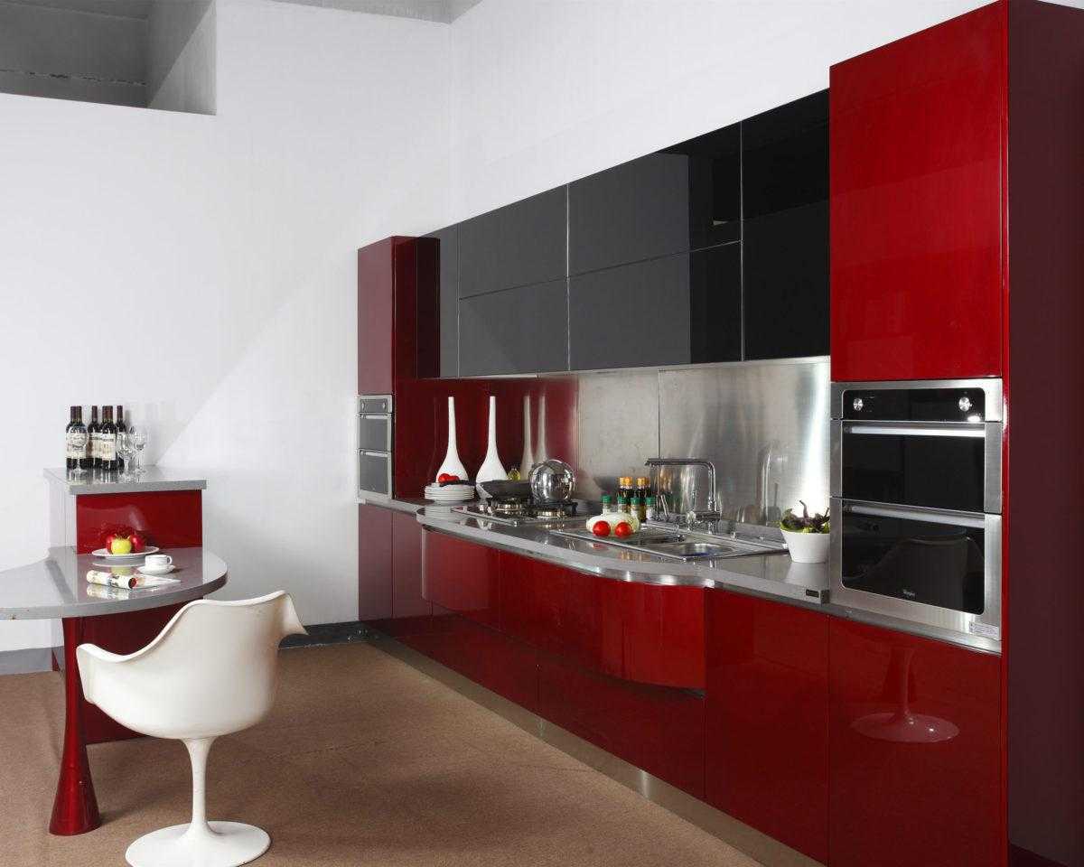 В красно-черных тонах следует сделать фасады гарнитура, а белый оттенок будет служить для них идеальным фоном. Что касается стиля интерьера, то он должен быть современным.