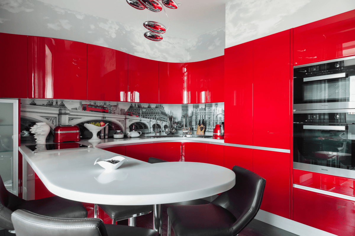 Стиль «модерн» — при его создании приветствуется обилие красного цвета. Желательно использовать глянцевые его варианты. Коралловые оттенки подойдут для фасадов, штор, декоративных элементов. Можно добавить несколько красных светильников, выполненных из стекла.