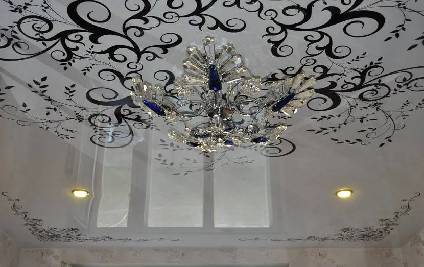 На фото натяжной потолок белого цвета с узорчатой фотопечатью.