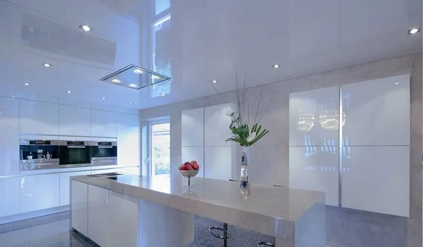 Для кухни белые натяжные потолки станут незаменимы. Белый цвет увеличивает пространство, как правило, кухни малы размерами. Натяжные поверхности не скапливают копоть, она легко удаляется, держат форму при разных температурах и терпят влагу.