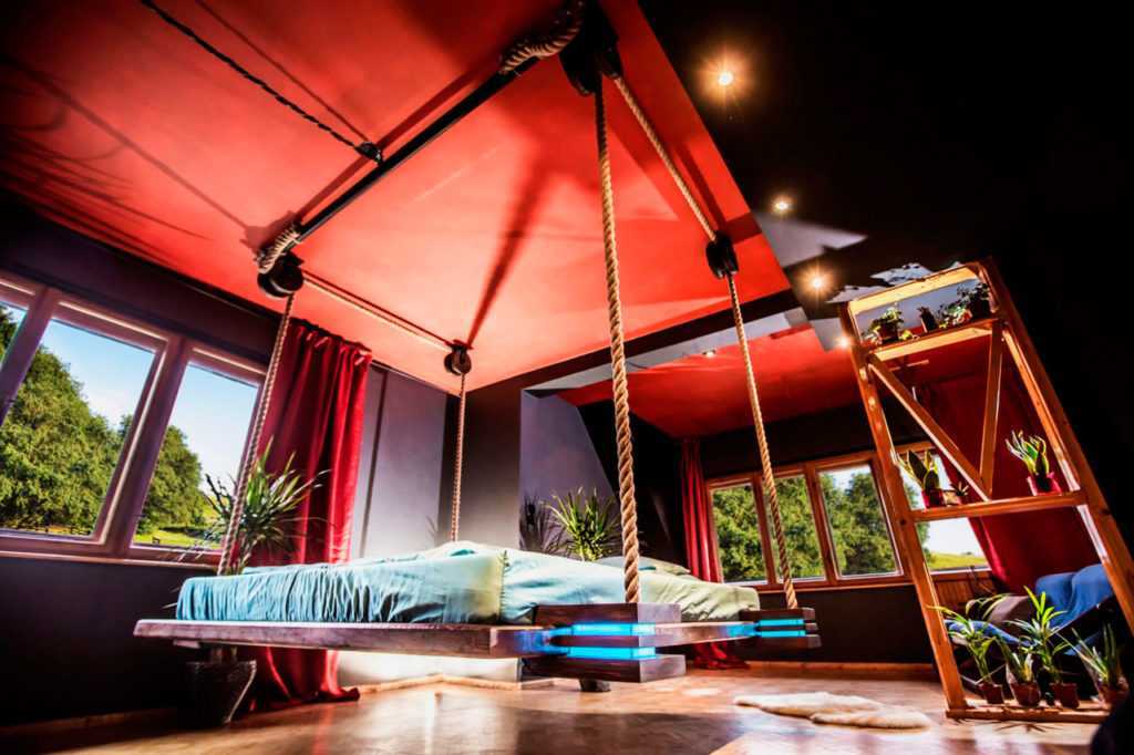 К сведению! Чем меньше опор, балок, столбов, тросовых растяжек, любых деталей подвеса будет использоваться, тем меньше конструкция навесного спального места будет похожа на времянку, жилье в бытовке или квартире с незаконченным ремонтом. Понятно, что навесные кровати под потолком в пятикомнатной квартире будут смотреться слегка странно, ну, может быть, кроме винтажного дизайна, требующего наличия второго яруса или двухъярусной спальной конструкции в детской комнате.