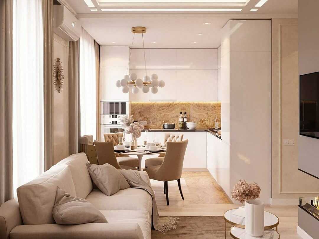 Кухня с диваном в красиво оформленной гостиной зоне – уникальная возможность создать современный дизайн.