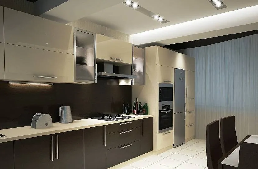 Бежевый оттенок — весьма удачное сочетание. Подходит для оформления кухни в классическом стиле. Очень интересно будет выглядеть гарнитур с нижними фасадами цвета венге и верхними бежевыми фасадами. Пол на такой кухне можно выложить из керамической плитки таких же тонов, в виде шахматной доски. Стены следует покрасить в бежевый цвет, подобрать шторы теплого шоколадного оттенка. Основания обеденного стола и стульев могут быть темными, с бежевой столешницей и сиденьями.
