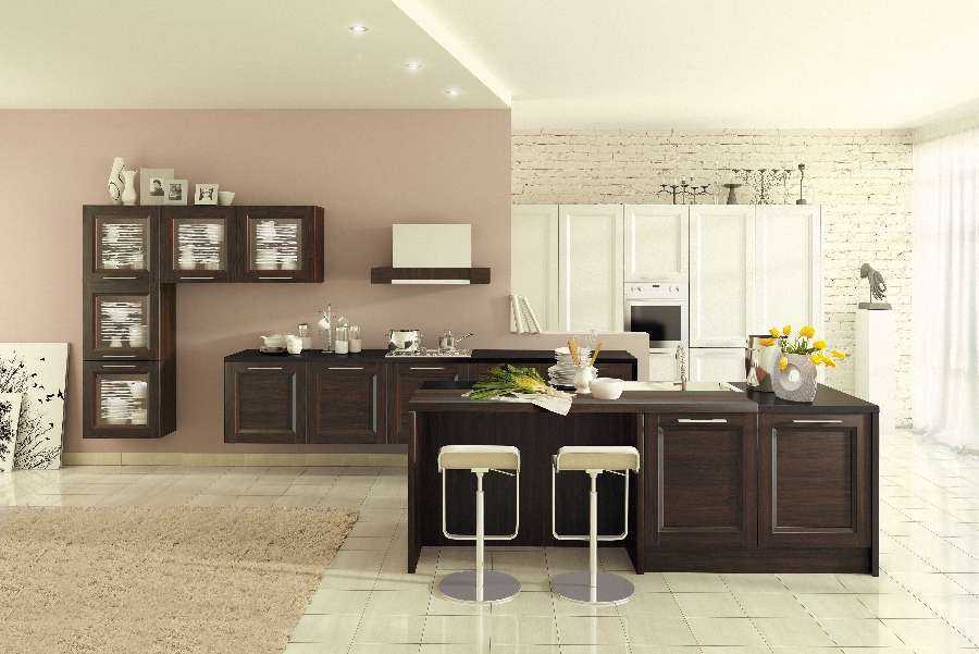 Цвет венге и беленый дуб — данный вариант также можно отнести к классическим сочетаниям, которые отлично подходят для обустройства элегантной и строгой кухни. Оттенок венге может быть и светлым, и темным. Чтобы кухня в такой цветовой комбинации выглядела действительно роскошно, рекомендуется отдавать предпочтение только дорогим натуральным материалам (массиву древесины, камню).