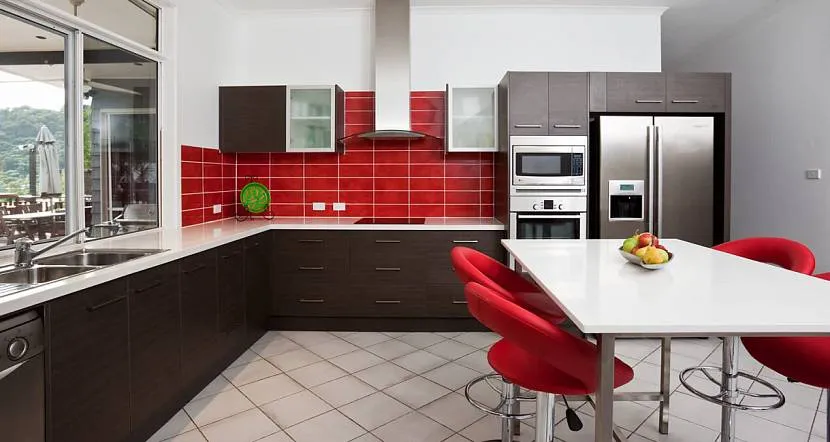 Органично будут смотреться несколько ярких дверец в гарнитуре венге, текстиль и аксессуары в красно-оранжевой гамме. Главное – сочетать тёмные и светлые элементы, чтобы гарнитур не выглядел грузным, а кухня – тесной и мрачной. Стены и пол лучше оставить светлыми – кремовыми, золотисто-жёлтыми.